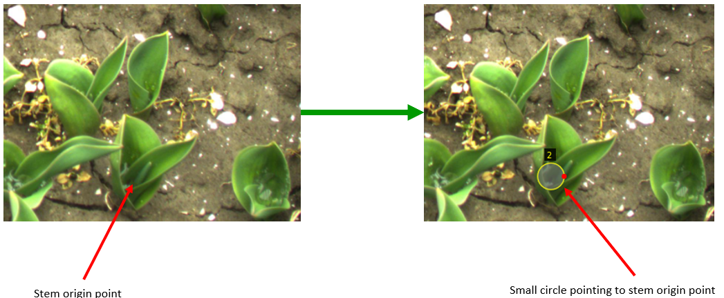 In het linker figuur hier onder zie je twee annotaties waarbij bijna de gehele plant met de cirkel beschreven wordt, en waarbij het centrum van de cirkels op de grond gericht staat. Maak de cirkels in dit geval wat kleiner en richt het centrum op de stam van de plant waar deze de grond uit komt (zoals in het rechter plaatje)