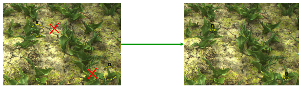 Wanneer een zieke plant overschaduwd wordt door en andere gezonde plant, annoteer ook dan de cirkel waar je denk dat de plant de grond uit komt. Ook als de stam dus niet goed zichtbaar is. Wanneer de stam van de zieke plant echt helemaal uit beeld is, annoteer dan geen cirkel.