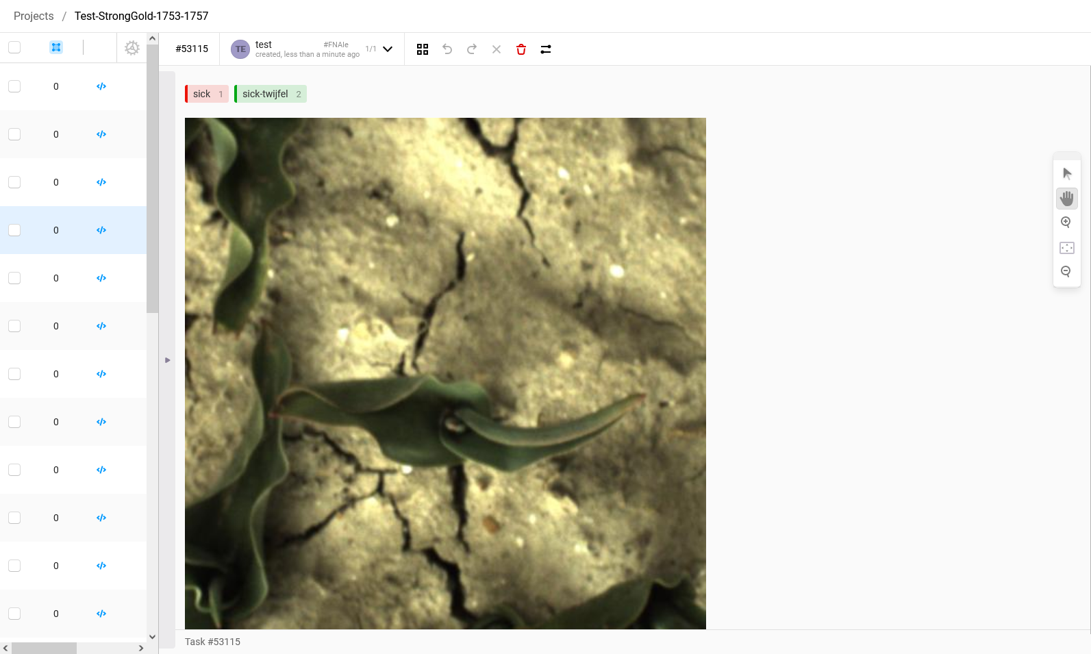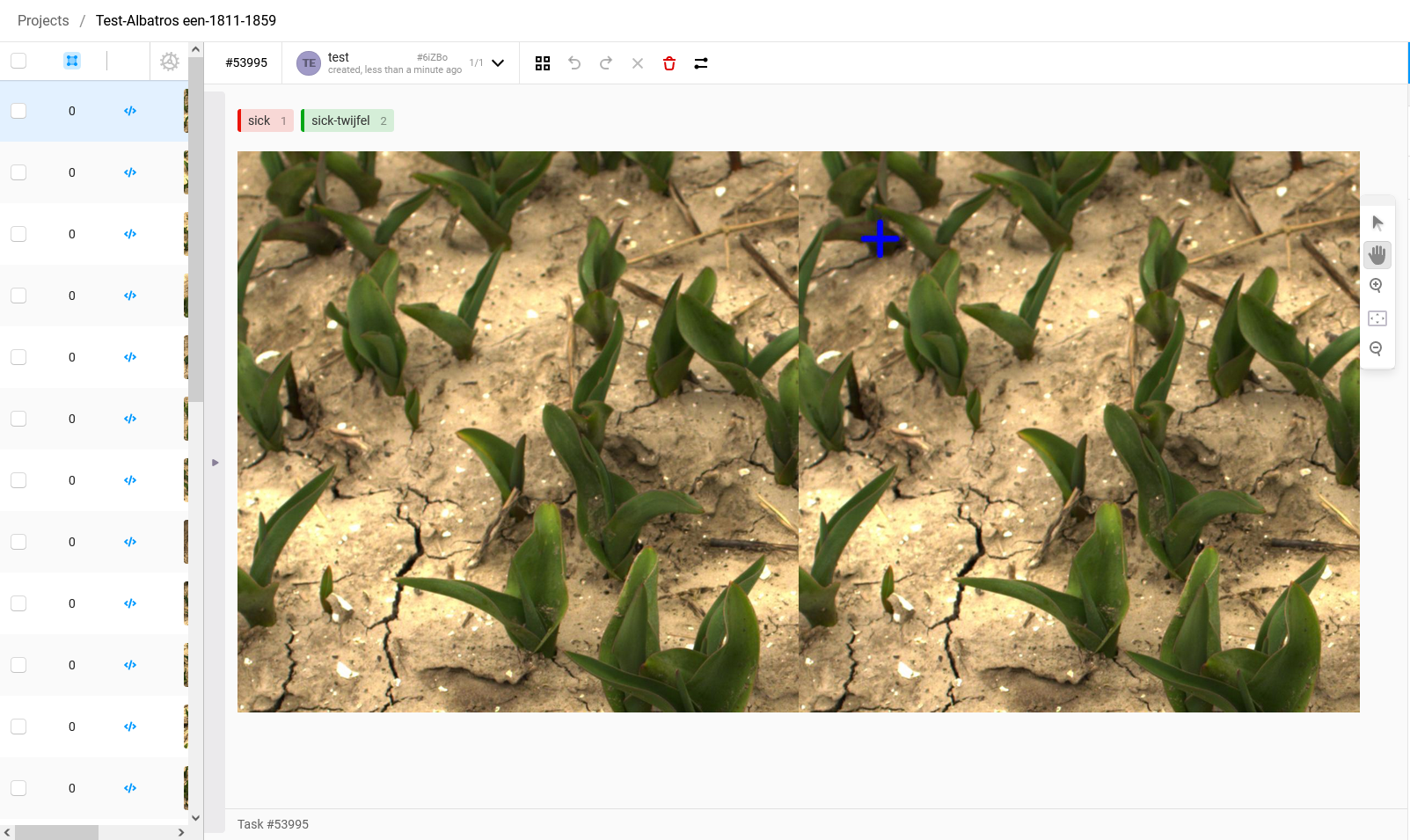 5. To create an annotation of a virus-infected plant, press '1' on the keyboard. You will see that the label will become red. If you are doubting whether the plant is infected and you would have liked to have a view from another angle before deciding, you can select the label 'sick-twijfel' by pressing '2'. If you see a plant that is obviously sick, a textbook example of a sick tulip, a plant that you are 100% sure that is sick then select the label 'super-sick' by pressing '3'.