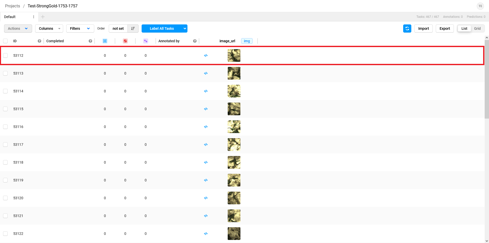 9. In the column lined in green, you can see a circle with the initial letters of your first name and last name if an annotation is saved for that image. The image you are currently working is highlighted in blue, as can be seen in the red lined row.
