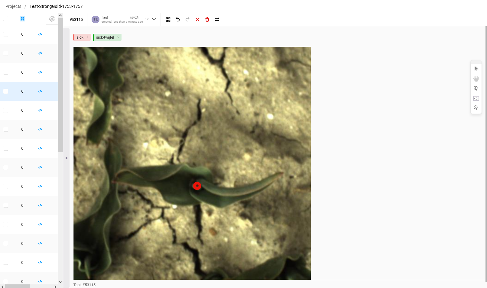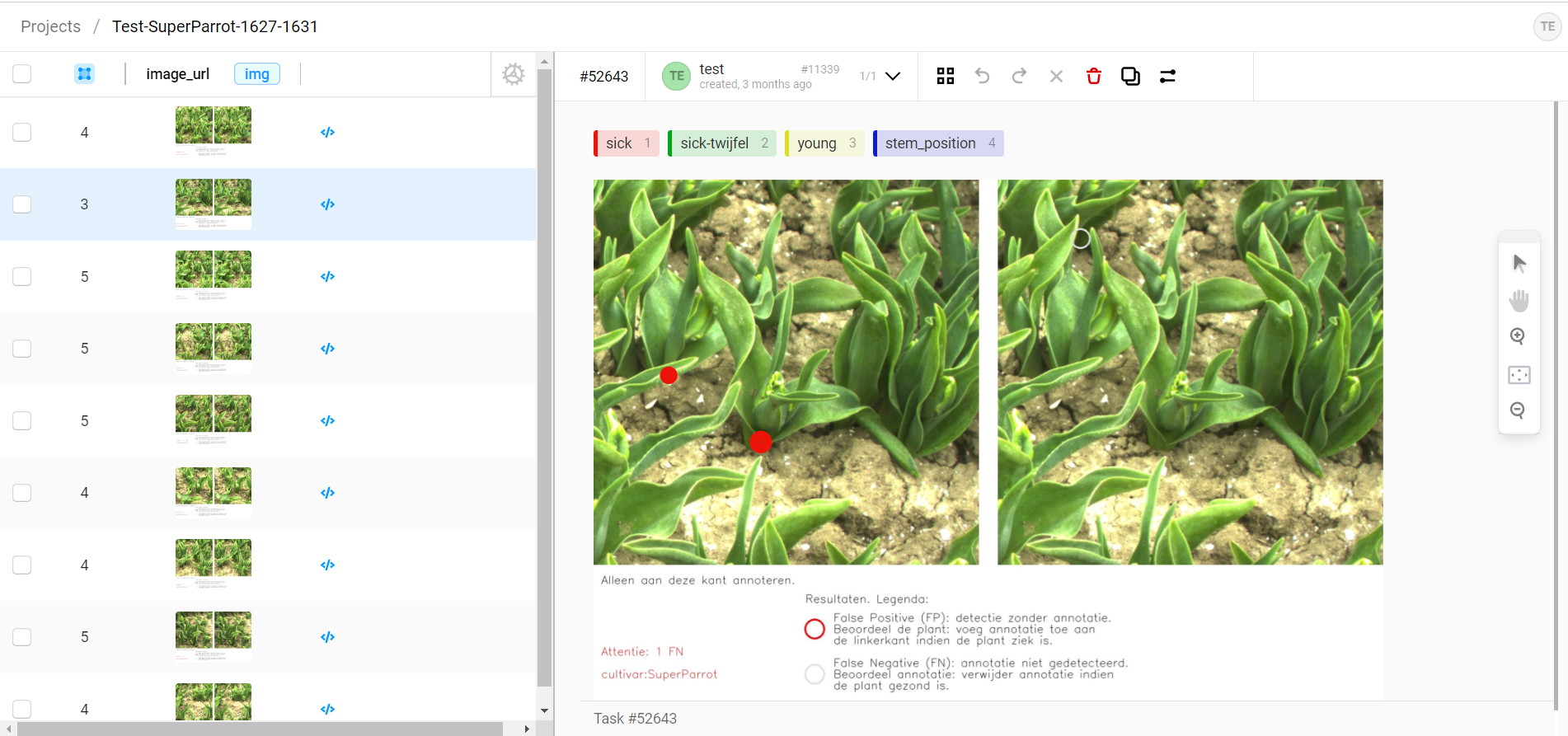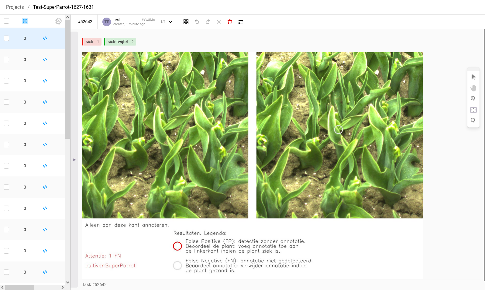 5. To create an annotation of a virus-infected plant, press '1' on the keyboard. You will see that the label will become red. If you are doubting whether the plant is infected and you would have liked to have a view from another angle before deciding, you can select the label 'sick-twijfel' by pressing '2'. If you see a plant that is obviously sick, a textbook example of a sick tulip, a plant that you are 100% sure that is sick then select the label 'super-sick' by pressing '3'.