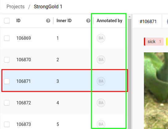 9. In the column lined in green, you can see a circle with the initial letters of your first name and last name if an annotation is saved for that image. The image you are currently working is highlighted in blue, as can be seen in the red lined row.
