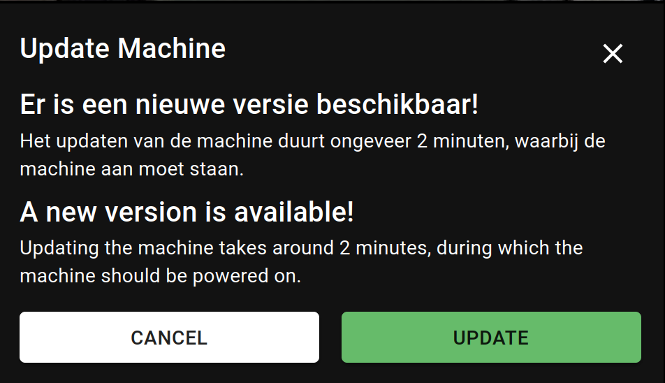 If you would like to update, press on the green button. After about two minutes the software will have been updated and you can restart. NB: Do not switch the machine off during the software update, this can cause serious problems.