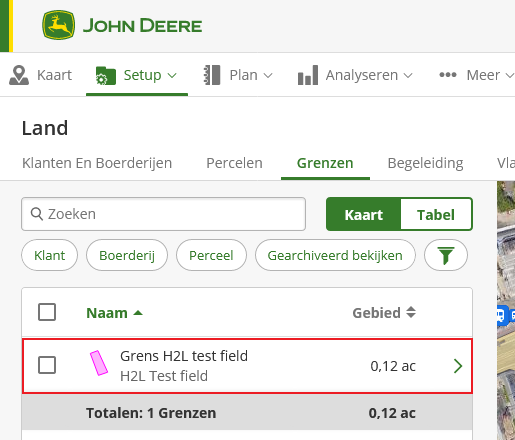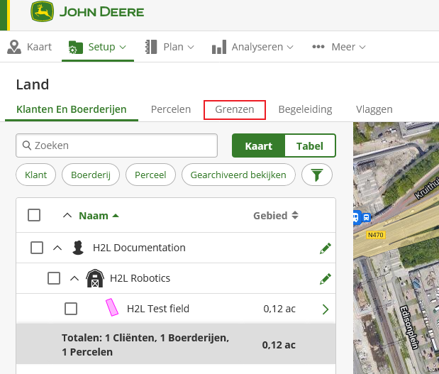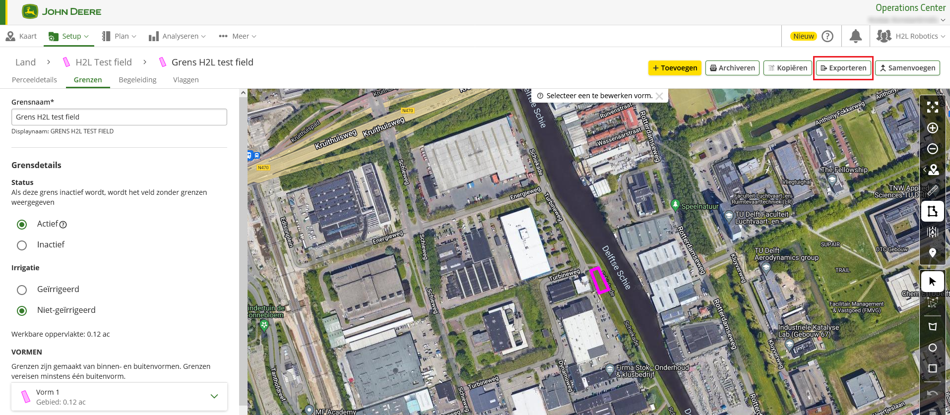 Hieronder wordt aan de hand van enkele screenshots stap voor stap beschreven hoe u de grens een perceel kunt exporteren als .zip vanuit de MyJohnDeere omgeving.