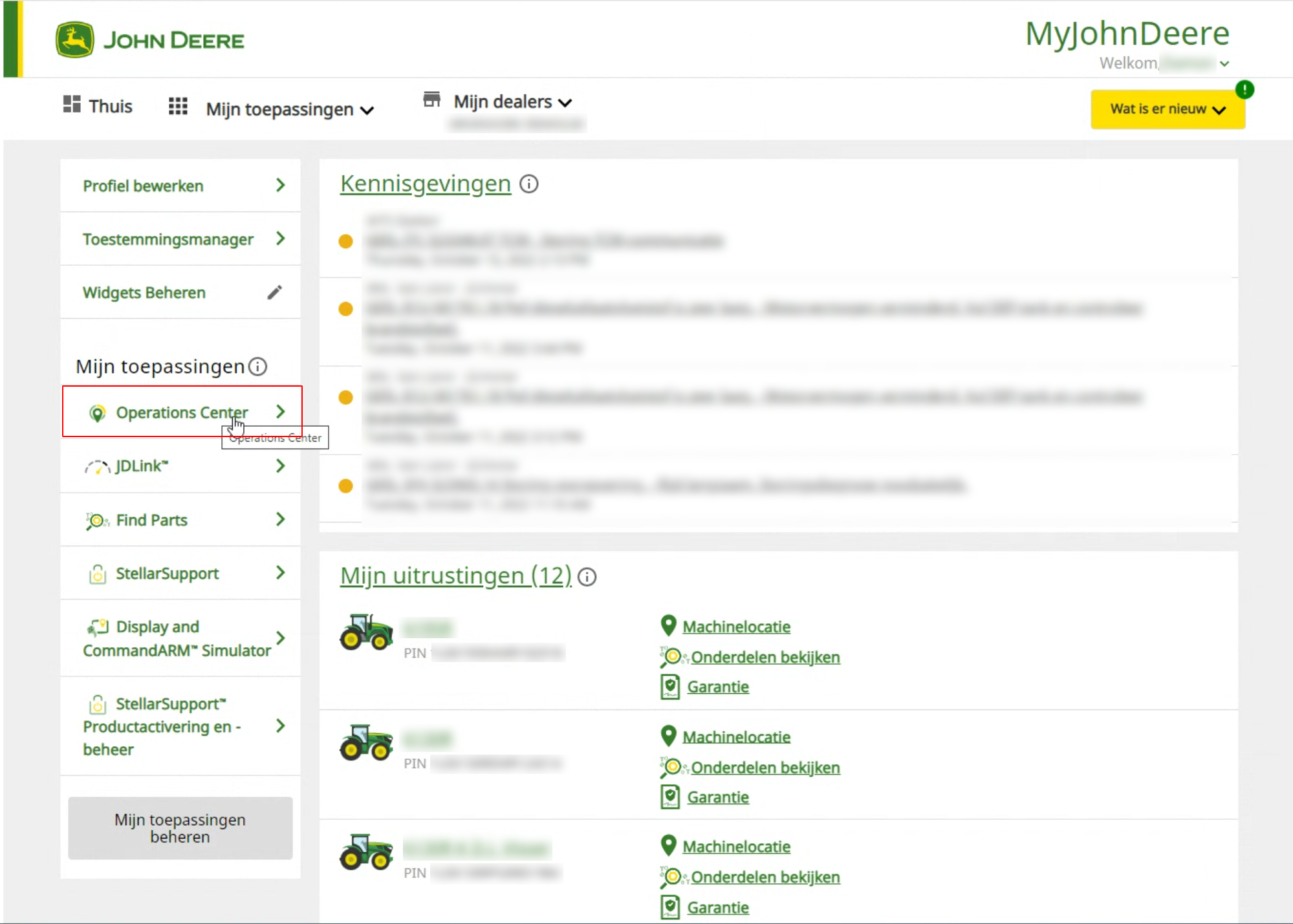 - Open MyJohnDeere en klik op 'Operations Center' (Links op het beginscherm onder 'Mijn toepassingen').